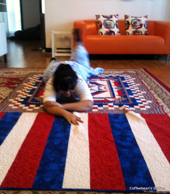 After the kids were done helping me to photograph the quilt; Amal threw herself down on it and proceeded to have a long discussion with me. I tried to bribe her to measure it for the final measurement and she eventually did so but I forgot to write it down!